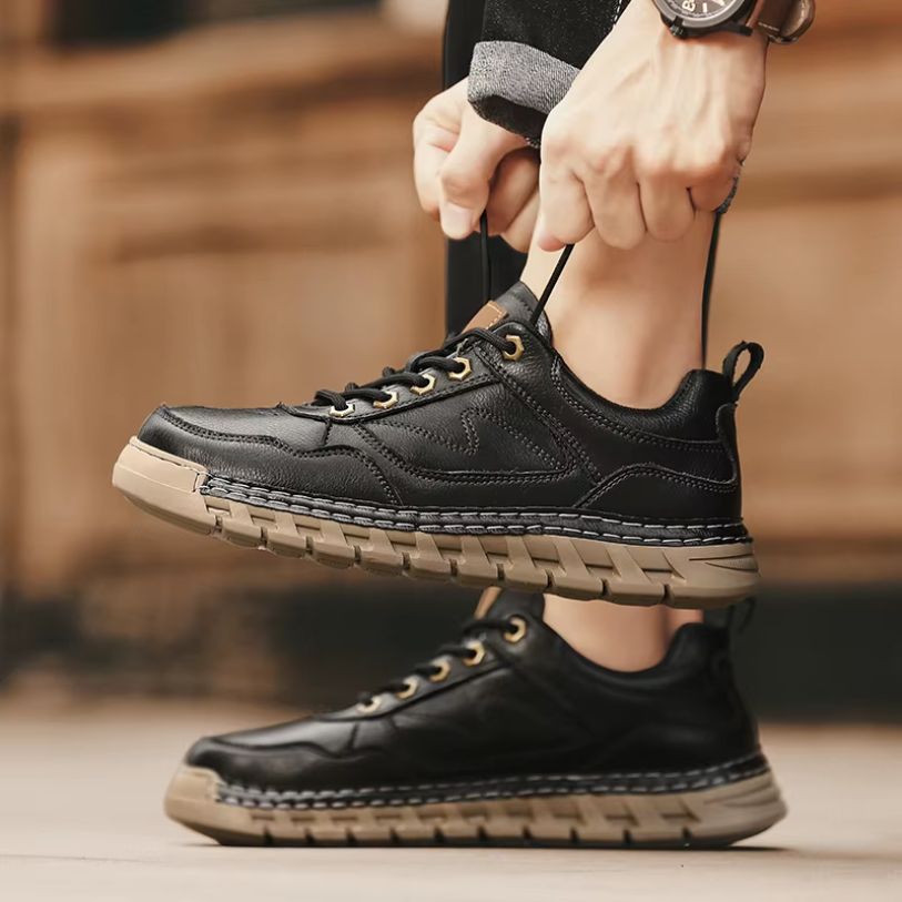 Cada par é finalizado manualmente por especialistas em calçados, com costuras reforçadas e acabamento refinado que expressa sofisticação e durabilidade.